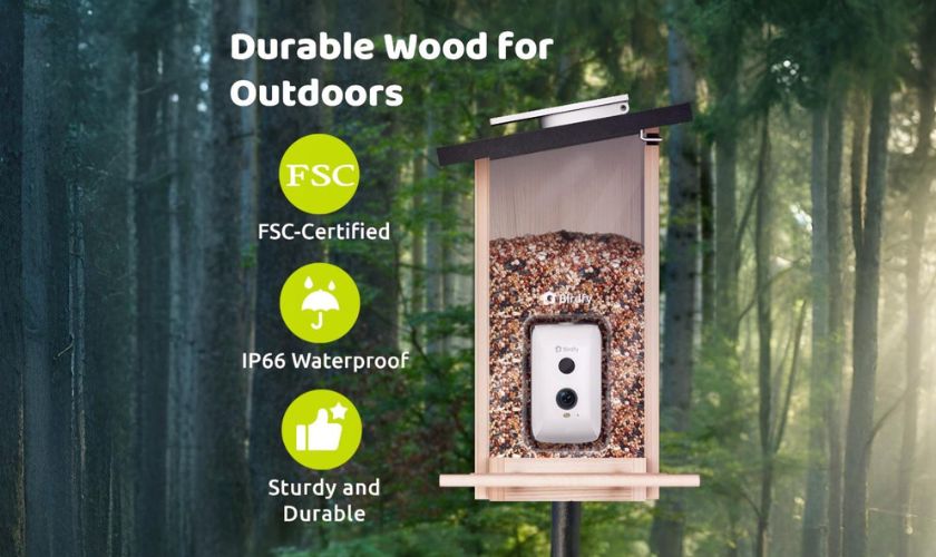 La Mangeoire Birdfy est fabriquée en bois de sapin durable, offrant une longue durée de vie tout en attirant naturellement les oiseaux. Son design solaire et sa construction résistante aux intempéries la rendent parfaite pour une utilisation extérieure, assurant durabilité et fiabilité.