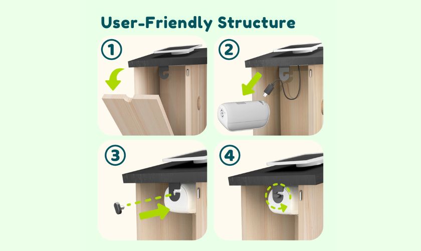 Ce nichoir est conçu à la fois pour les oiseaux et pour les utilisateurs. Le toit incliné offre un environnement de nidification confortable, tandis que les perchoirs, les trous de ventilation et le drainage assurent un espace sûr et bien ventilé pour les oiseaux. Il est facile à installer, à nettoyer et à entretenir – un habitat parfait pour les oiseaux et une expérience fascinante d'observation des oiseaux pour vous.
