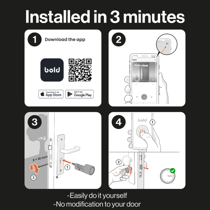 La configuration du Bold Elite est simple et ne nécessite aucune expertise technique ni aucun outil spécial. Une fois installé, le verrou offre une autonomie de trois ans, ce qui réduit le nombre de remplacements et garantit une fiabilité constante pendant de nombreuses années..