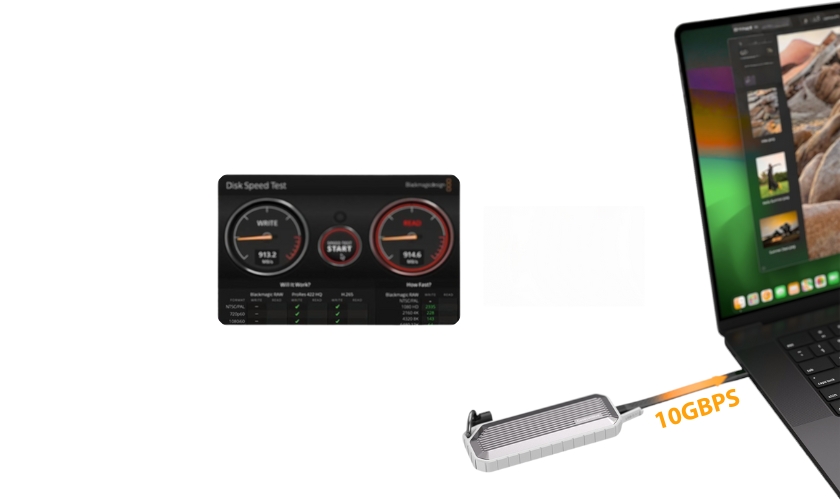 Équipé d’un contrôleur USB4 10Gbps, ce boîtier offre des vitesses de transfert stables allant jusqu’à environ 1000 Mo/s. Les fichiers vidéo 4K/8K volumineux, les bibliothèques de photos RAW et les archives de projets peuvent être ouverts, déplacés et modifiés directement depuis le SSD externe sans retard frustrant.
