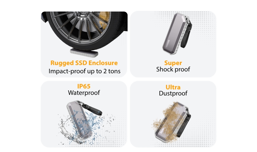 Le boîtier durable et renforcé est conçu pour protéger vos données dans des conditions difficiles. Avec une certification IP65 étanche, le boîtier résiste à la pluie et aux éclaboussures, tandis que sa conception totalement antipoussière le rend adapté à une utilisation en extérieur, industrielle ou sur site. La coque résistante aux chocs est testée jusqu’à 2 tonnes de pression, et la structure anti-choc protège le SSD des secousses et vibrations.