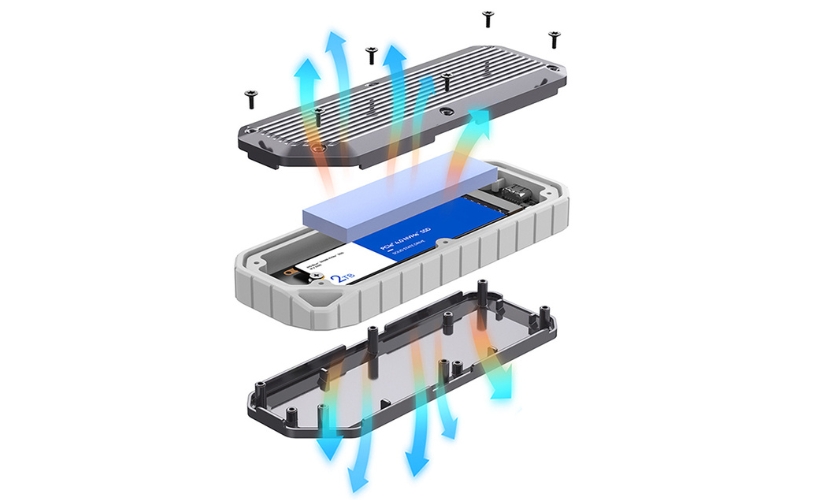 L’installation ne prend que quelques minutes : ouvrez le boîtier avec le tournevis fourni, insérez et fixez votre SSD M.2, appliquez le tampon thermique en silicone et refermez le boîtier. Connectez-le via USB-C et votre stockage robuste et rapide est prêt à l’emploi.