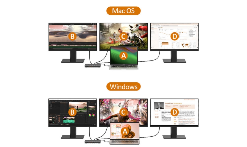 Support multi-écran DisplayLink : connectez jusqu'à trois écrans externes, incluant HDMI 8K (DP Alt Mode) et double sortie 4K via DisplayLink – même sur MacBook M1 et M2.
