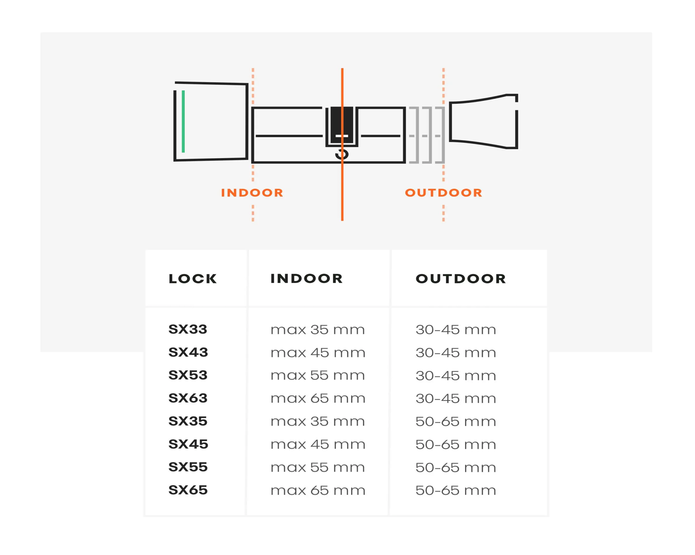 Pour identifier facilement le modèle adapté à votre porte, vous pouvez déterminer sa longueur en vous basant sur les deux derniers chiffres du nom du modèle, en suivant le format SX[intérieur][extérieur]. Pour vous aider, reportez-vous au tableau de mesures ci-dessous.