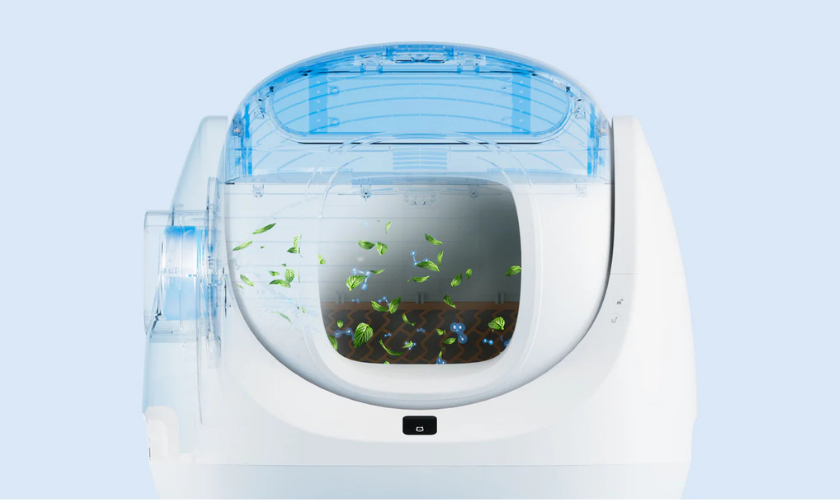 Bac fermé avec neutraliseur d’odeurs et activateur, installable sur le côté de la litière, pour une élimination efficace des odeurs.