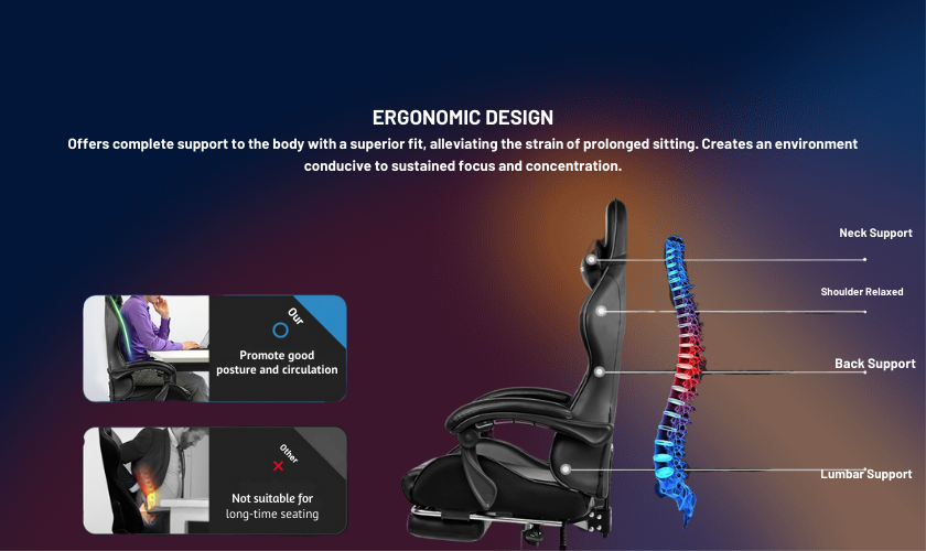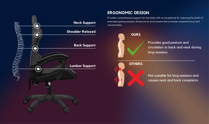 Malgré son prix accessible, la chaise gaming Ranqer Apollo propose des fonctionnalités haut de gamme comme le réglage en hauteur, l'inclinaison ajustable et des coussins ergonomiques. Les coussins lombaire et cervical fournis favorisent une posture correcte et réduisent les tensions au niveau du dos et du cou pendant les longues sessions de jeu.